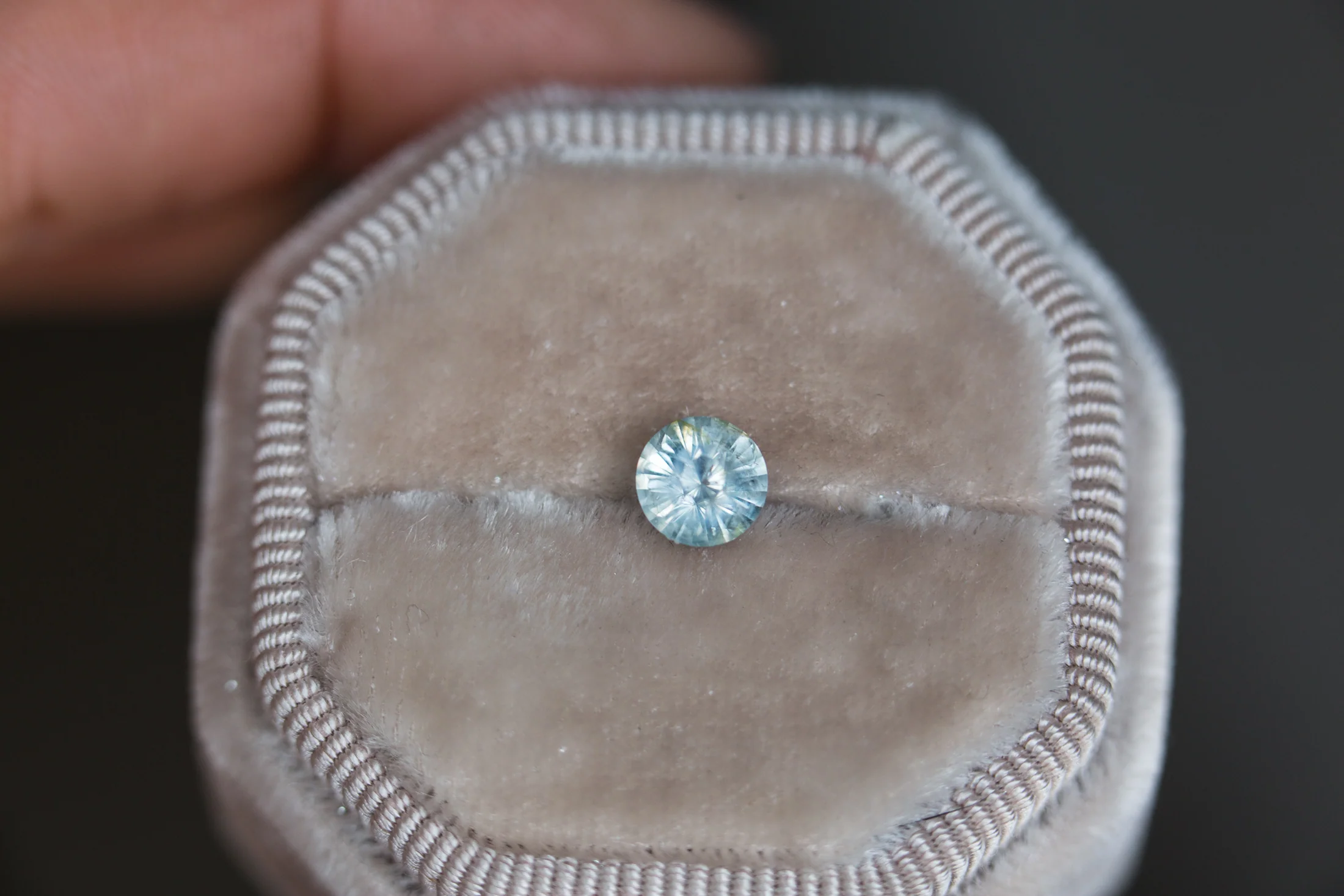 -1ct, 5.9mm round icy blue sapphire, Montana origin. This stone is slightly opaque with a unique cut. Has a touch of yellow/green in a few corners that really makes this stone stand out!