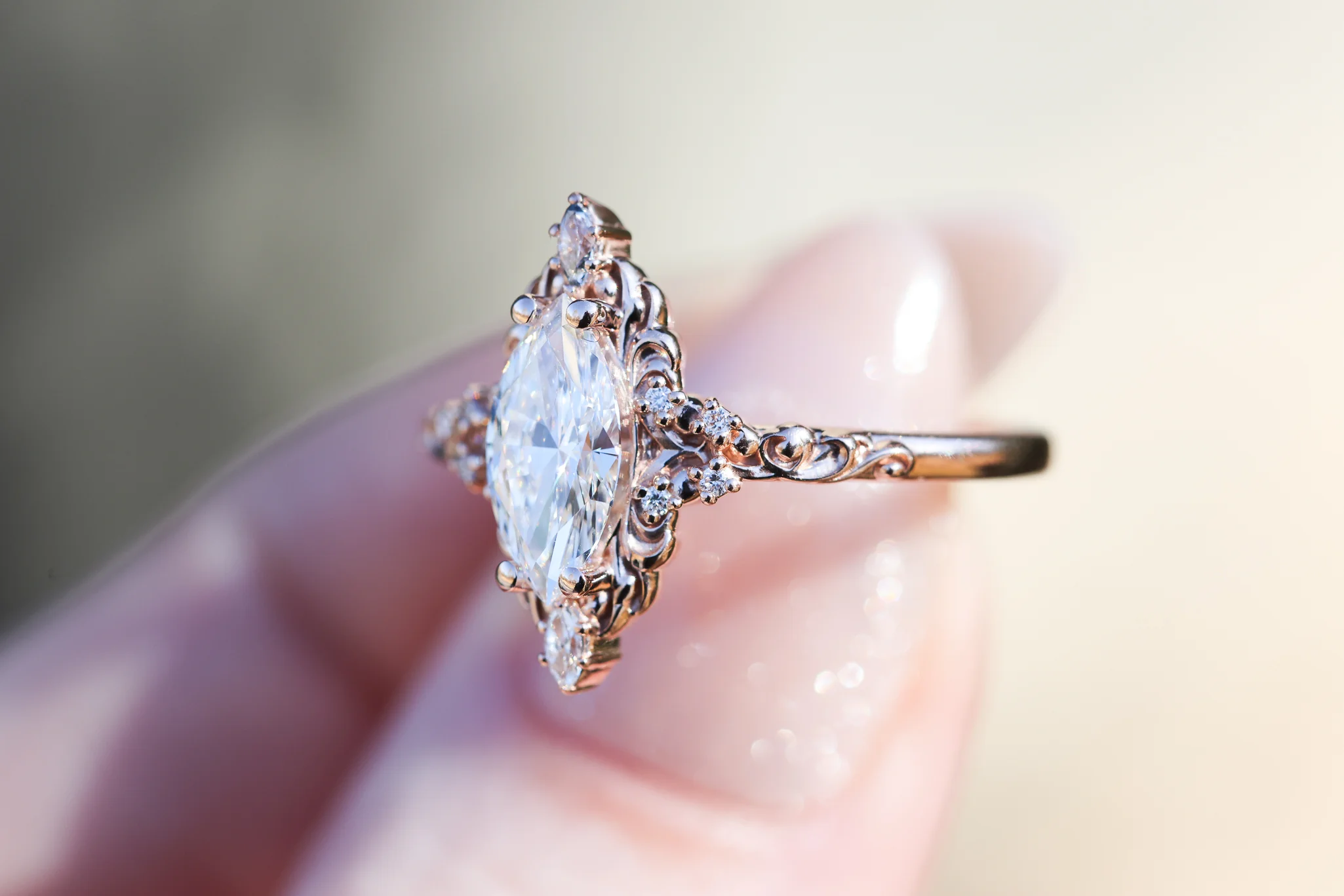 - The filigree swirls might change a little bit depending on the size/shape of the center stone. A longer stone (oval, marquise, pear) will have a larger dip while a round stone won't have as large as one!