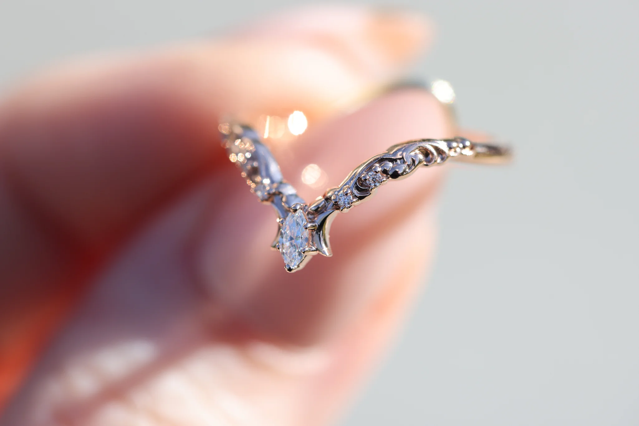 - Deep curved filigree. This is a very deep curve so looks best with my Aurora three stone or another ring that needs a deep curve