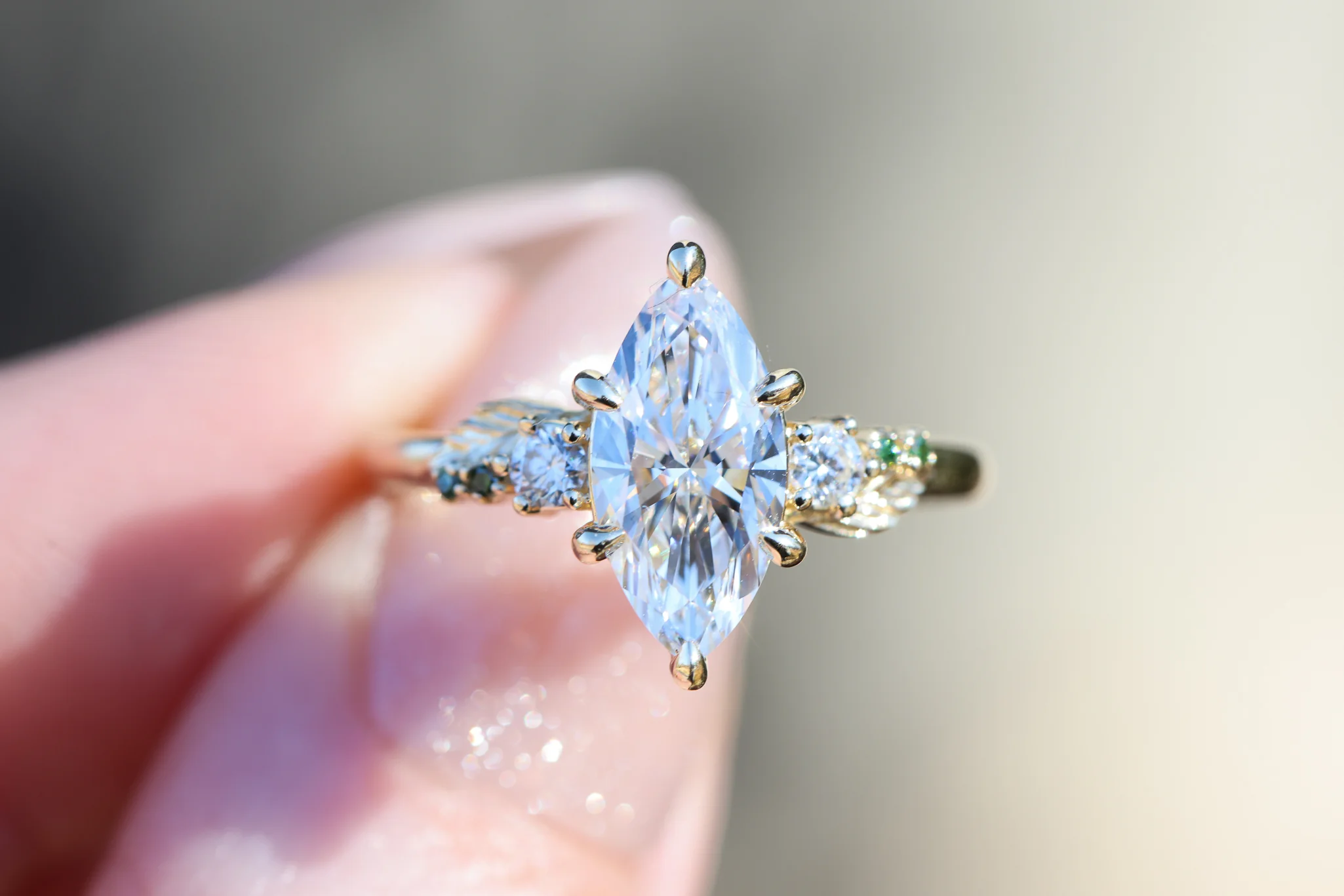 - Asymmetrical leaves, one on each side wrapping around the side stones