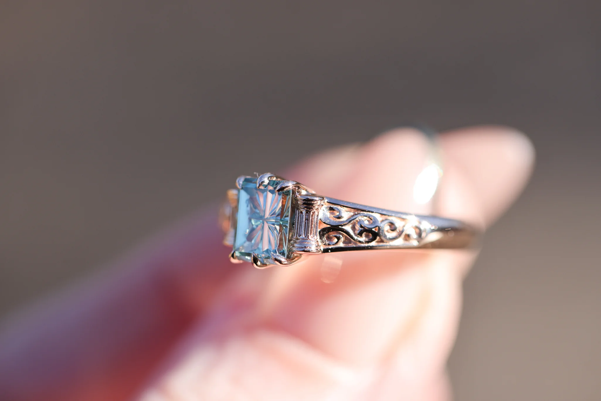 -Center: 1.17ct rectangle starbrite sapphire cut by John Dyer, Montana unheated