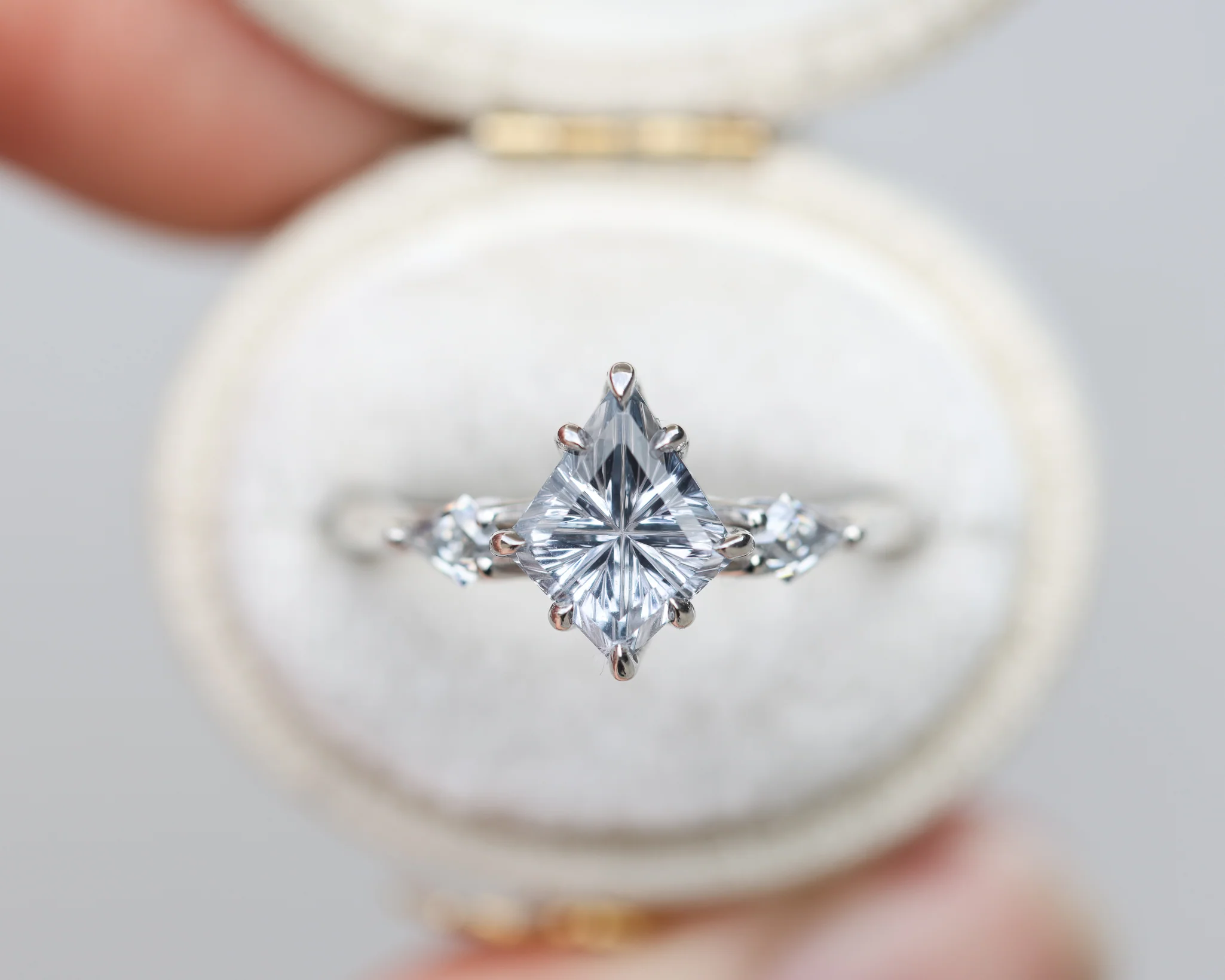 - 1.72ct 9.4x7.7mm kite cut starbite center, silver/grey with a hint of lavender unheated