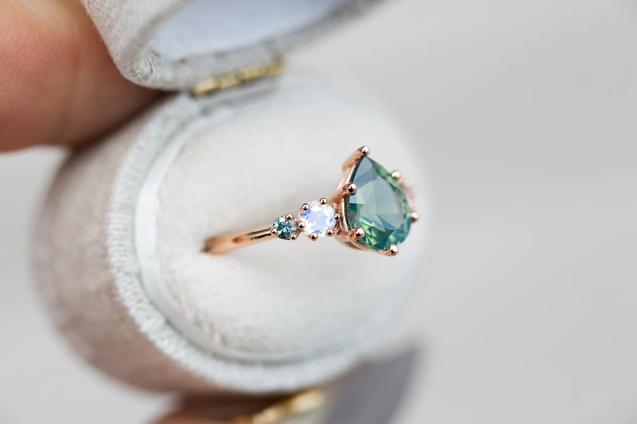 - Two, 2mm round end stones (teal/green/blue sapphire pictured in sample photo)